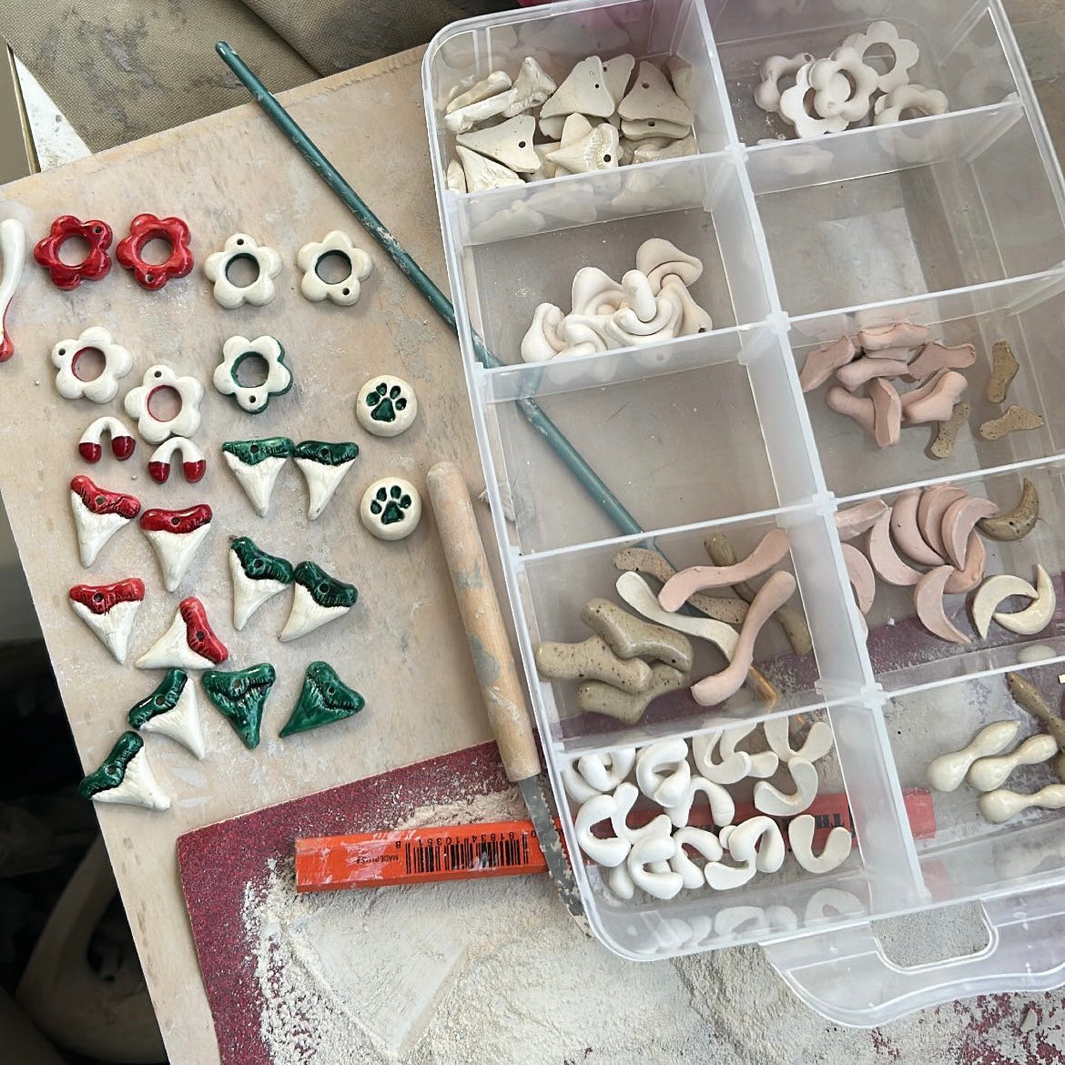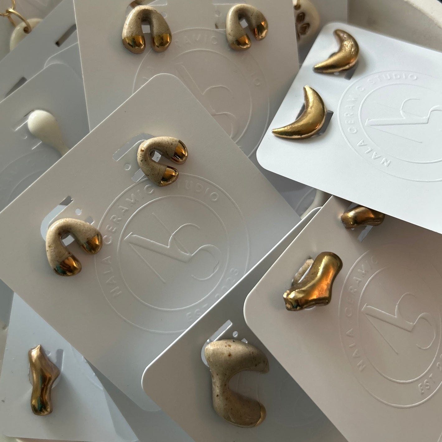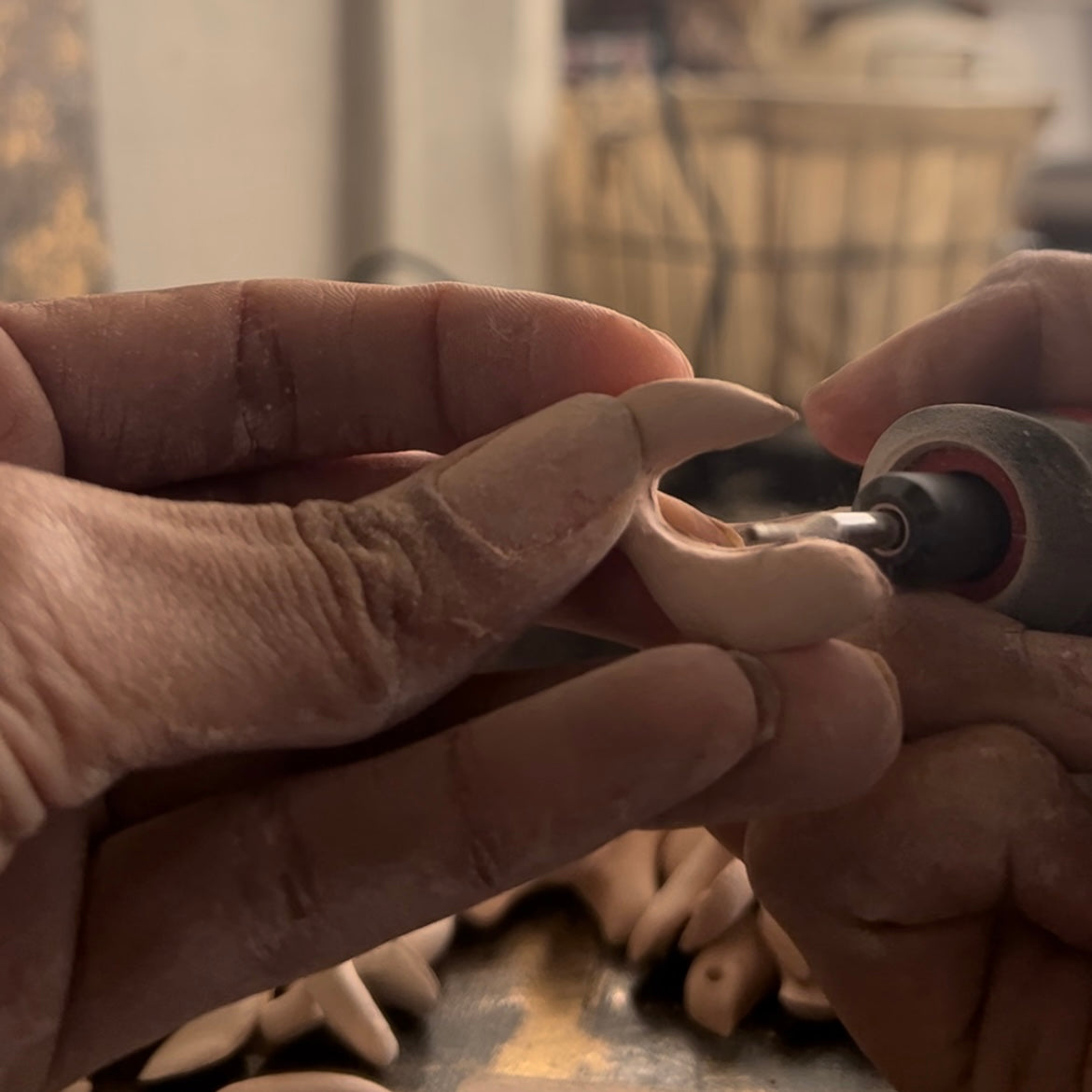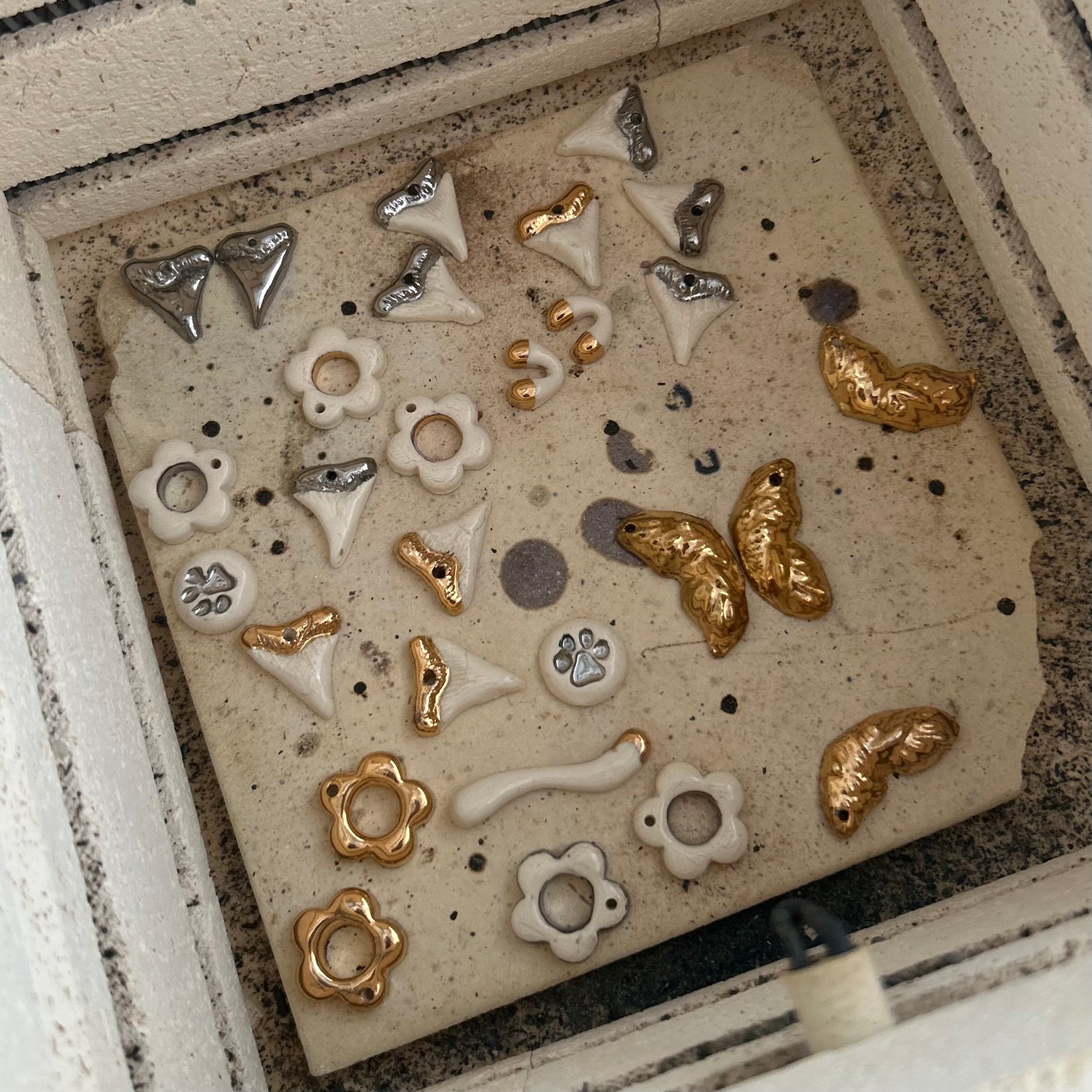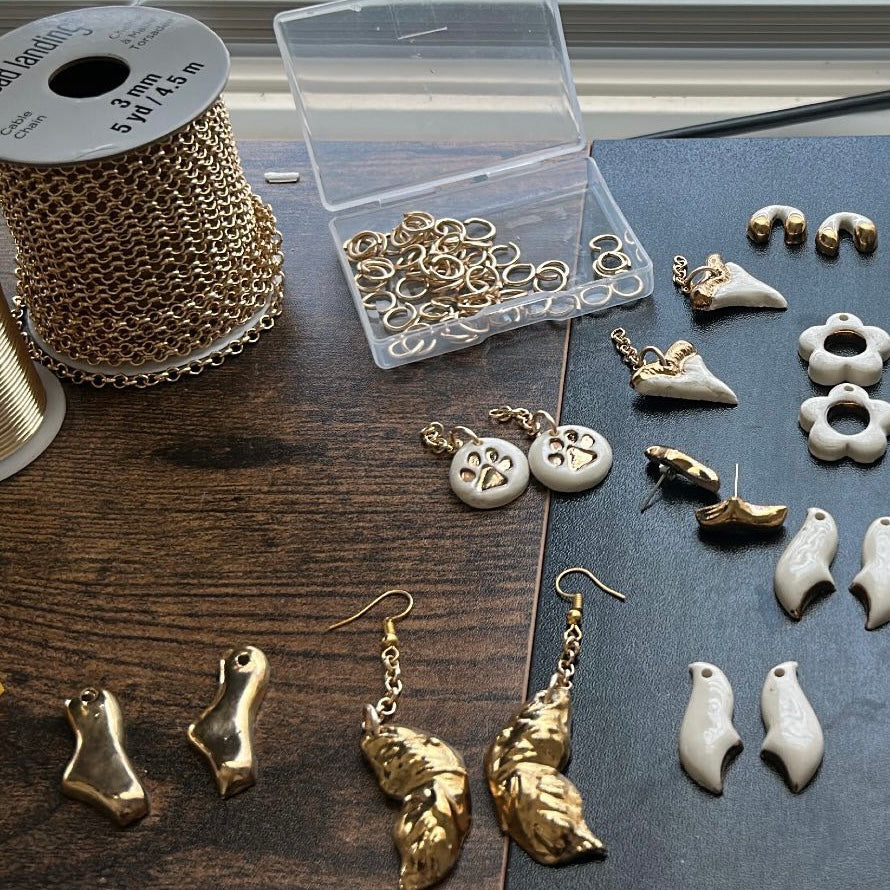 The jewelry is glazed and fired to cone 6. After the glaze firing, pieces are accented with a 22k gold Premium Luster, White Gold luster, or Mother of Pearl luster.