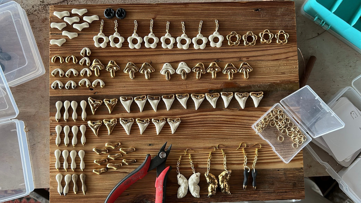 Jump rings and ear wires are handmade with the help of step mandrels and custom 3D printed templates to ensure quality and continuity among pieces. Any chains are prefabricated and assembled between jump rings and ear wires.