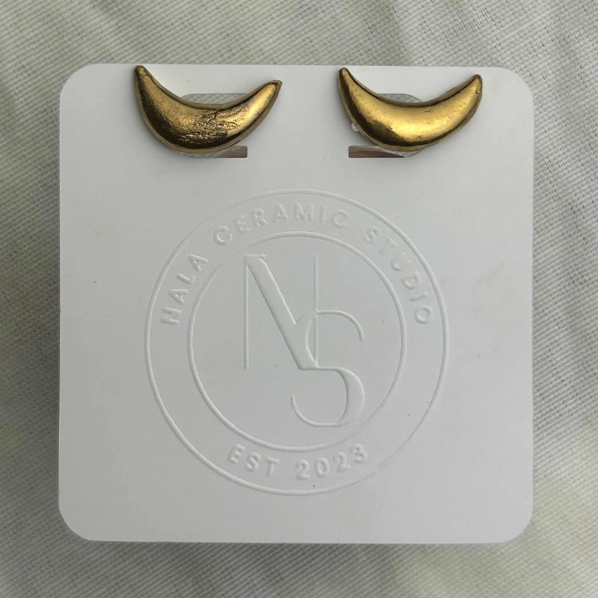 Say hello to our elegant handmade gold crescent stud earrings! These exquisite accessories are designed to add a touch of celestial beauty to your look. Crafted with meticulous care, each earring features a delicate gold crescent moon design. The intricate detailing adds a sense of grace and charm, making these earrings truly captivating. Made from high-quality porcelain and 22k gold luster, these stud earrings are not only visually appealing but also durable and long-lasting. The gold plating adds a touch of luxury and ensures a timeless shine that will catch the light beautifully. These earrings are versatile enough to be worn on various occasions, whether it's a casual day out or a special event. They make a thoughtful gift for anyone who appreciates the beauty and symbolism of the moon, or as a treat for yourself to add a touch of celestial elegance to your jewelry collection. With their comfortable and secure hypoallergenic stud fastening, these earrings are designed to stay in place throughout the day without causing any discomfort. They are lightweight and easy to wear, so you can enjoy their beauty effortlessly. Don't miss out on these exquisite handmade gold crescent stud earrings. Order yours today and embrace the celestial allure of these enchanting accessories.