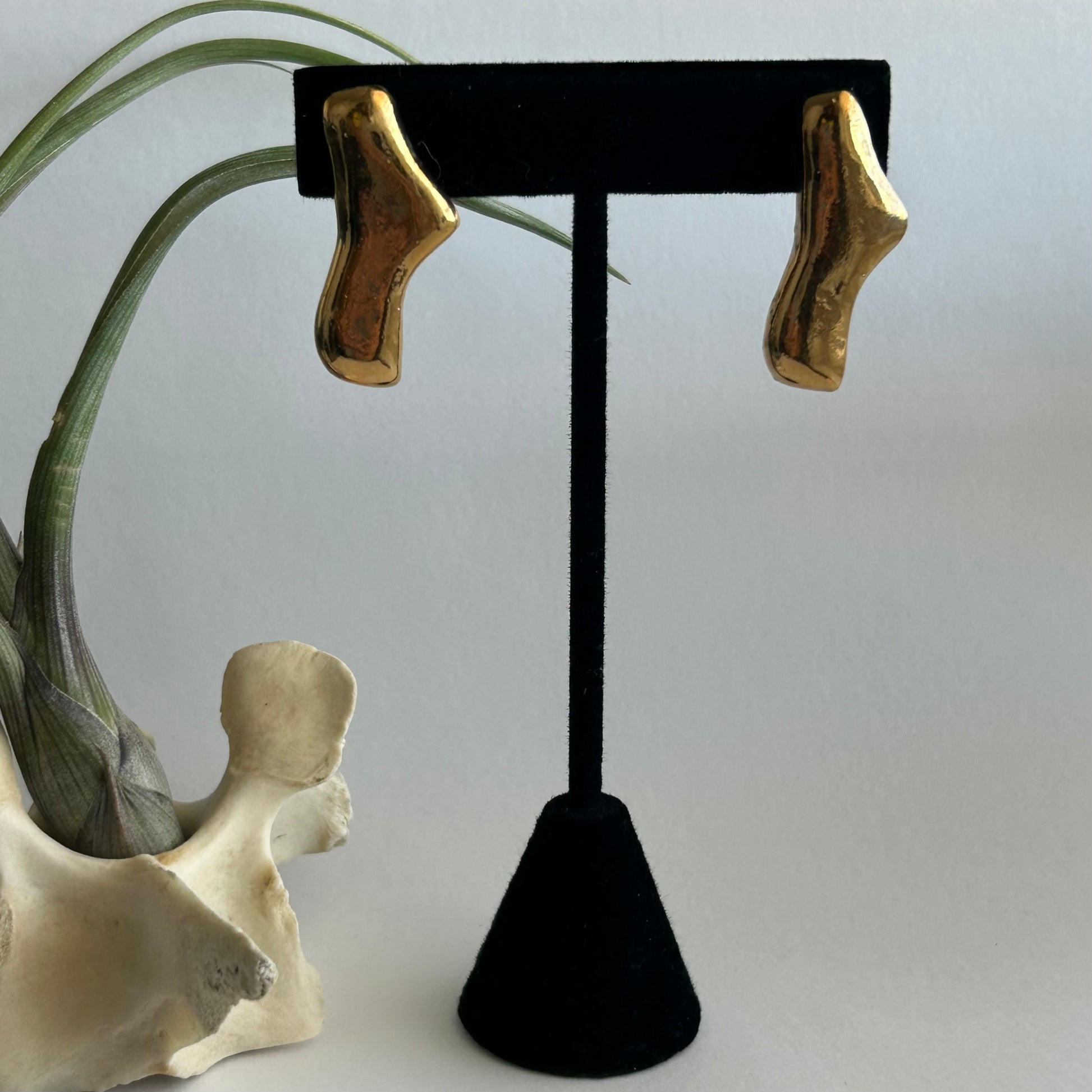 Introducing our stunning handmade gold soft curvy stud earrings! These elegant accessories are designed to add a touch of sophistication and style to your everyday look. Crafted with the upmost care, each earring features a unique soft curvy design that is both modern and timeless. The gentle curves create a graceful and feminine silhouette that is sure to catch the eye. Made from high-quality porcelain and 22k gold luster, these stud earrings are meticulously handmade to ensure both durability and beauty. The gold finish adds a touch of luxury and elegance, making these earrings perfect for any occasion, whether it's a day at the office or a night out on the town. These stud earrings are designed for comfort, and feature hypoallergenic posts. The lightweight construction allows you to wear them all day long without any discomfort. Let these earrings be a subtle and stylish addition to your everyday look, effortlessly elevating your style to the next level. Whether you're treating yourself or looking for the perfect gift, these handmade gold soft curvy stud earrings are a versatile and timeless choice. They are a beautiful and understated way to express your personal style and add a touch of sophistication to any outfit. Don't miss out on these exquisite handmade gold soft curvy stud earrings. Order yours today and embrace the elegance and beauty they bring to your jewelry collection.